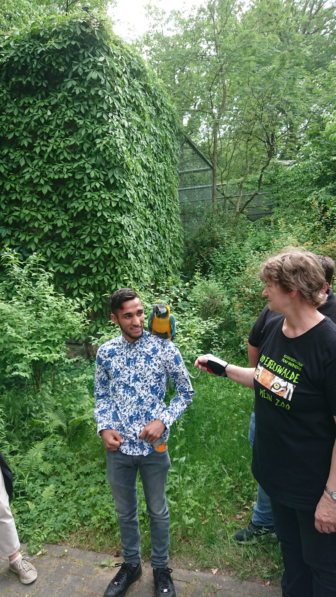Nach einer Tierparade mit Lama, Schlange und Papagei, die einige um den Hals oder auf die Schulter bekamen, starteten wir in Richtung des am 02. Juni eingeweihten sprechenden Baumes. Entlang des Rundweges und mit unterhaltsamen Anekdoten durch den Zoodirektor ging es zielgenau in das Affengehege.